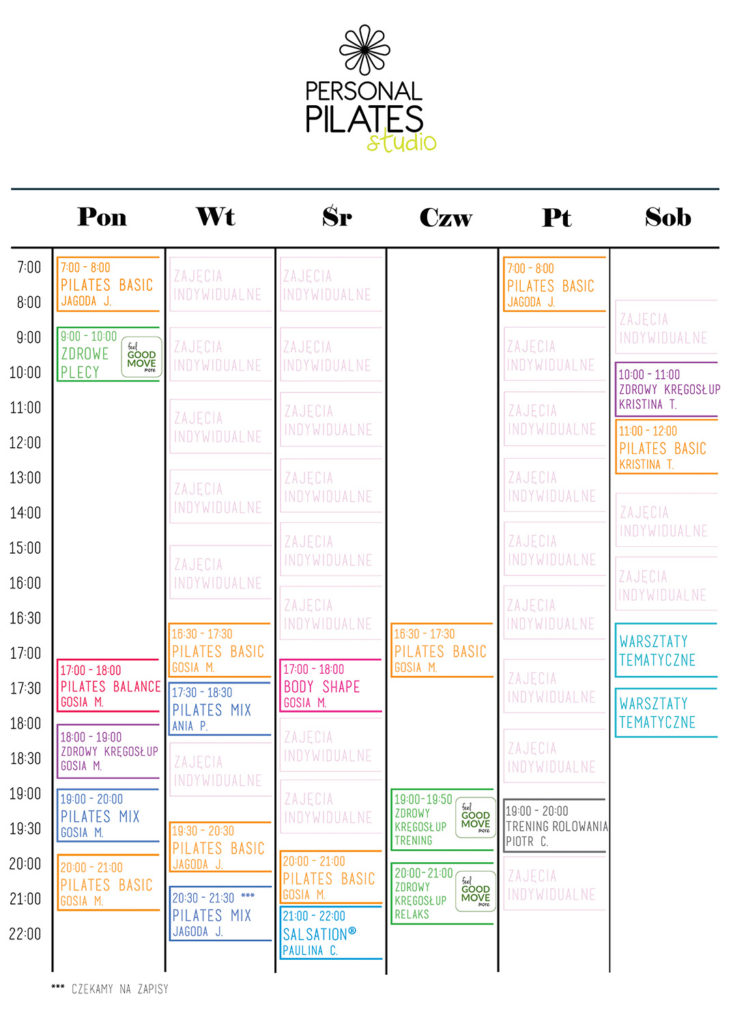 Z przyjemnością informujemy Was o nowych zajęciach, które są zdecydowanie w duchu realizowanego do lat naszego celu - therapy fitness - czyli nauczyć was ćwiczyć podczas zajęć tak, aby w ciągu dnia poruszać się poprawnie i dzięki temu czuć się w swoim ciele doskonale! Wszystkie nasze zajęcia są skierowane na to aby ten cel osiągnąć. Dodatkowo teraz będziecie mogły skorzystać z zajęć ZDROWY KRĘGOSŁUP prowadzone przez naszych wykwalifikowanych trenerów ale również przez współpracującą z nami fizjoterapeutkę Kasię Witek - Sokołowską. Zajęcia z fizjoterapeutką to wszystkie te zajęcia które oznaczone logo GOOD MOVE.