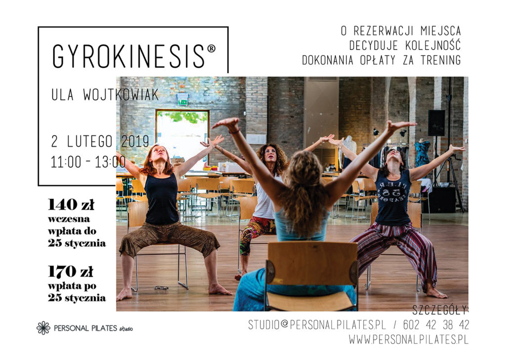 Chcemy wam przedstawić GYROKINESIS®. To innowacyjny dynamiczny trening mobilizujący ciało do podążania we wszystkich kierunkach ruchu kręgosłupa. Kluczem jest płynność podyktowana specjalnie dobranymi technikami oddechu. Koniec każdego ruchu jest początkiem następnego, stąd jego cyrkuliczny charakter. Dzięki temu nie istnieje ryzyko wystąpienia kontuzji stawu, ponieważ przechodzi on przez pełen zakres swojego ruchu bez wstrząsu i zbytniego napięcia. Metoda ta uruchamia cały łańcuch mięśni zaczynając od tych miedzy guzami kulszowymi, miednicy idąc ku górze tworzy przestrzenie międzykręgowe. Mobilizuje, skutecznie wzmacnia, uelastycznia i wydłuża kręgosłup, masuje organy wewnętrzne, otwiera zmysły, likwiduje napięcia i bóle, polepsza koordynacje i równowagę, genialnie rzeźbi sylwetkę, koryguje wadliwą postawę, uczy ciało nowych zdrowych nawyków ruchowych, otwiera je na nowe wyzwania.